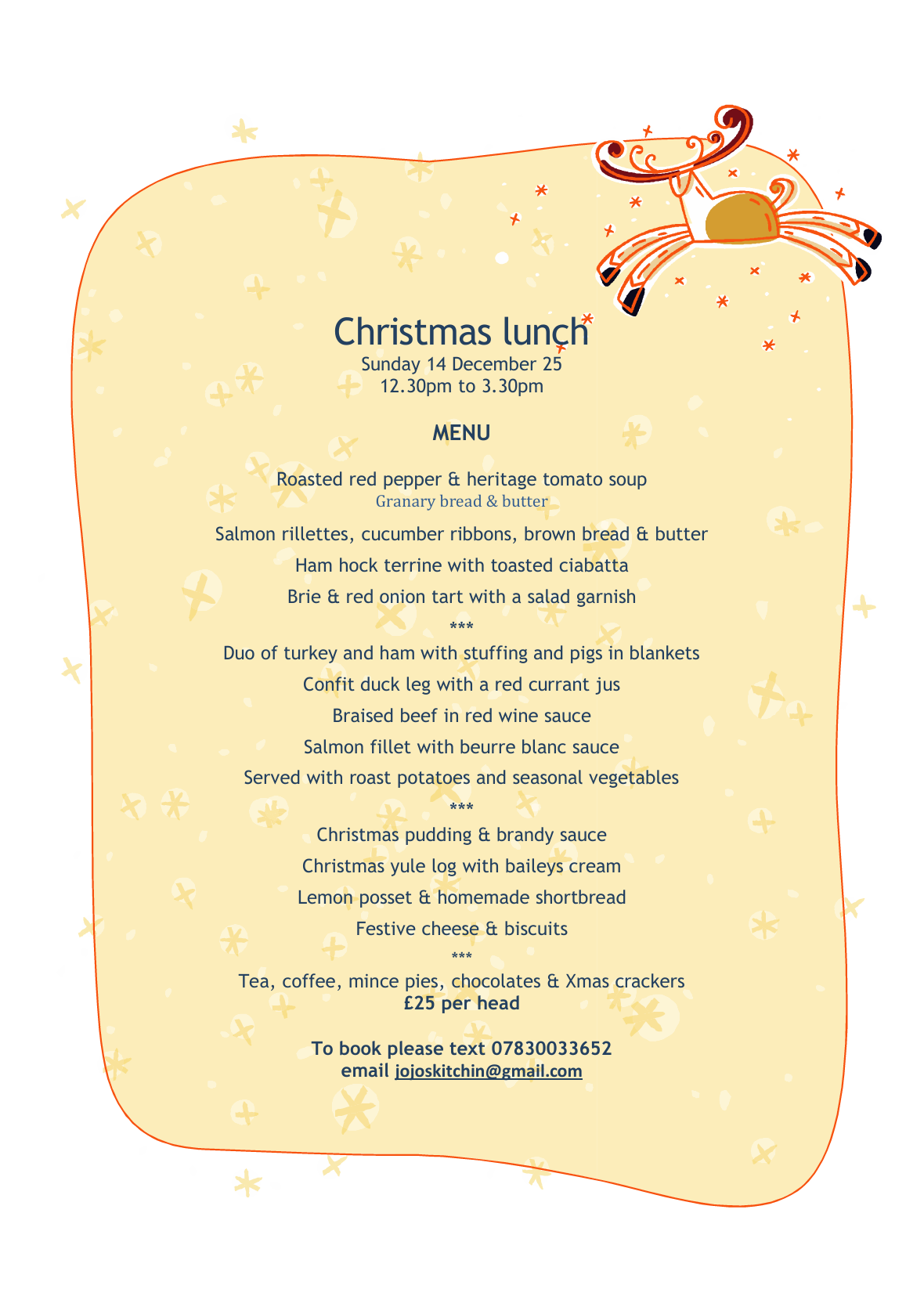 To reserve your place, please text 07830 033652 or email jojoskitchin@gmail.com.